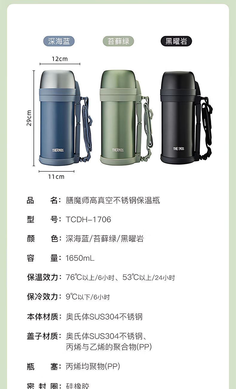 顏 色:MG苔蘚綠 NVY深海藍(lán) OBS黑耀巖 容 量:1650ml 類 型:旅行壺 定 制:可以定制 材 質(zhì):304不銹鋼 保 溫:6小時(shí)大約60°C 保 冷:6小時(shí)大約12°C