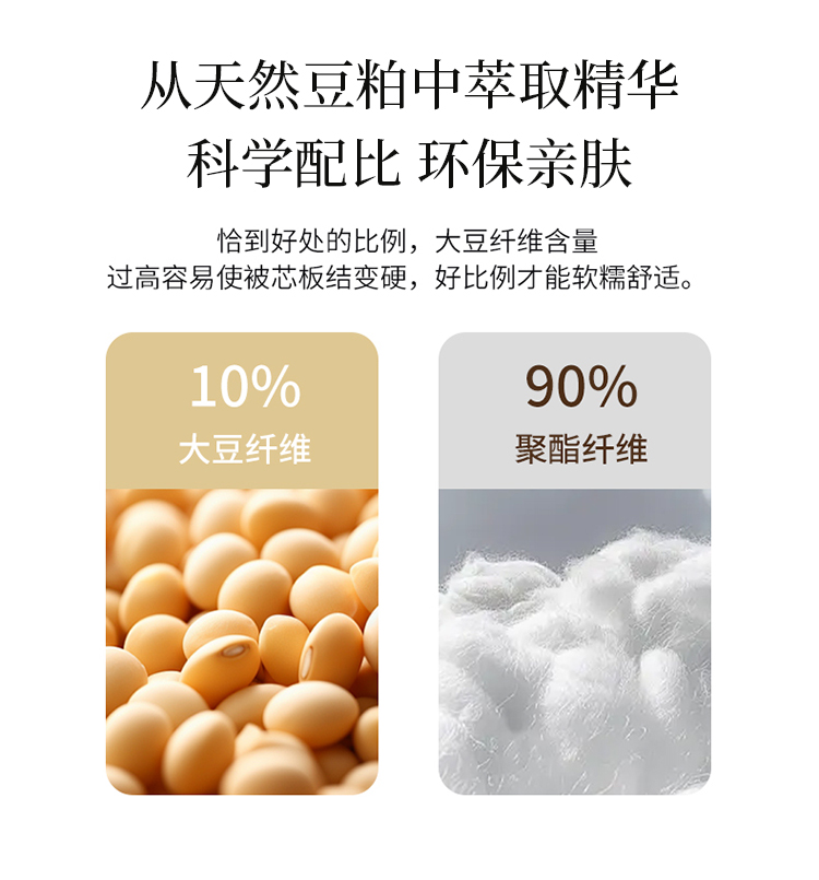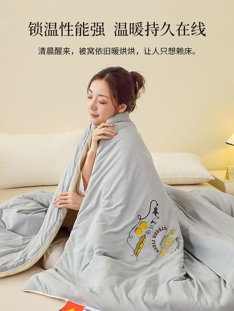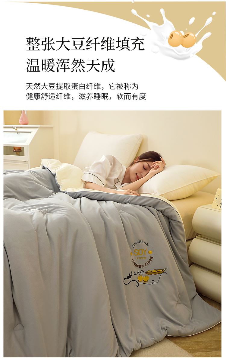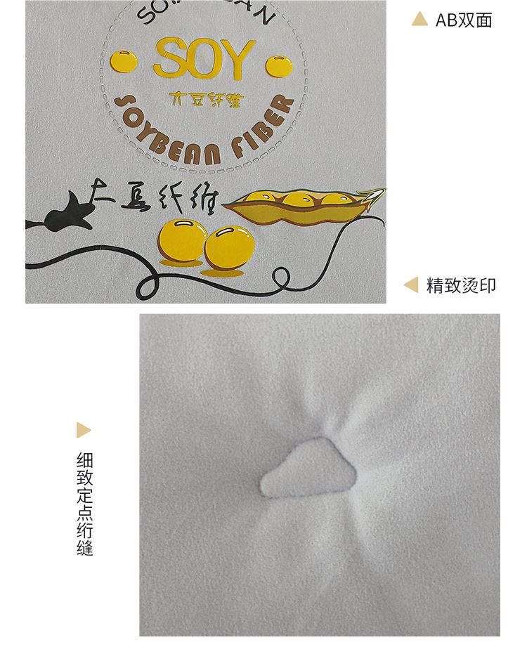 大豆纖維以豆粕為原料,從中提取其中的球蛋白,通過(guò)深加工,制成的大豆纖維手感柔滑,親膚透氣,柔韌豐盈,具有良好的透氣恒溫性。大豆纖維+羽絲棉填充黃金配比,飽滿輕盈。針織面料,成品點(diǎn)絎定位工藝,固定填充,不跑棉不變形,品質(zhì)有保證。