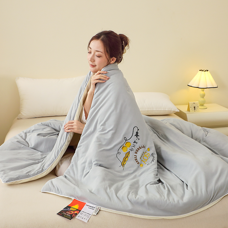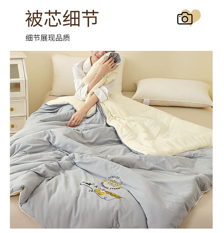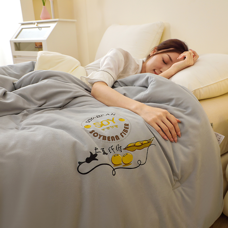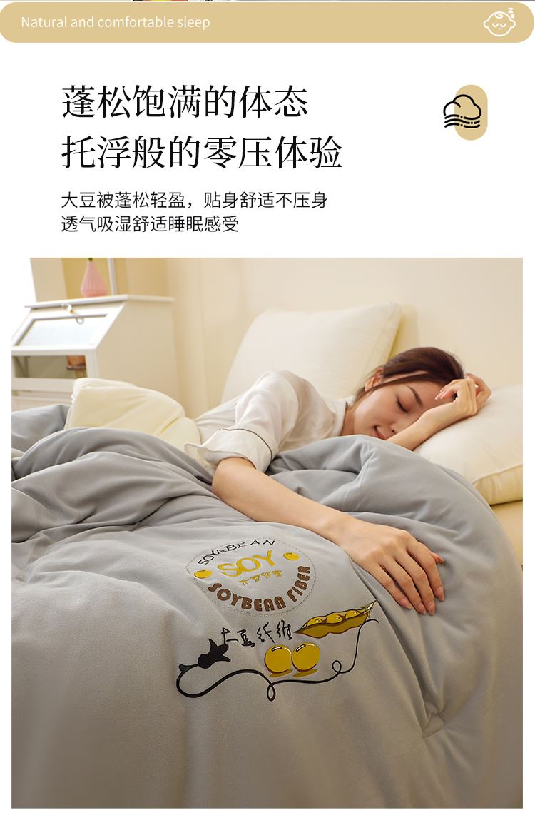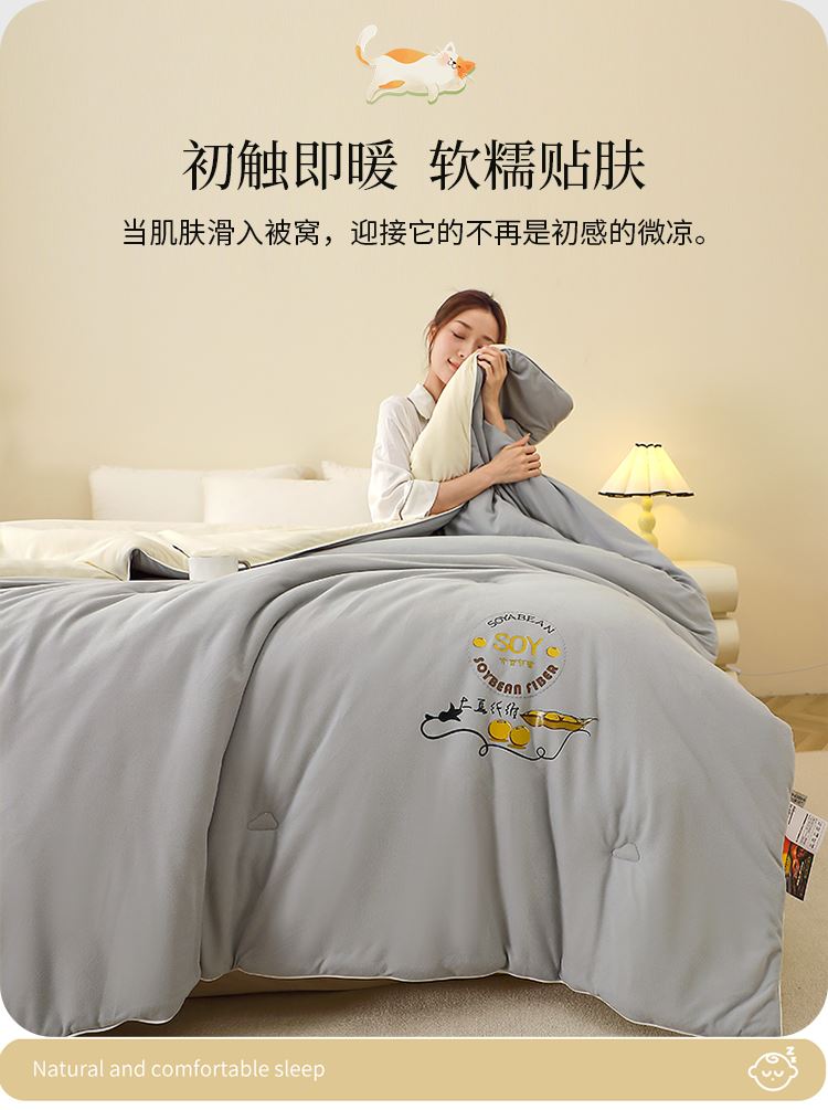 大豆纖維以豆粕為原料,從中提取其中的球蛋白,通過(guò)深加工,制成的大豆纖維手感柔滑,親膚透氣,柔韌豐盈,具有良好的透氣恒溫性。大豆纖維+羽絲棉填充黃金配比,飽滿輕盈。針織面料,成品點(diǎn)絎定位工藝,固定填充,不跑棉不變形,品質(zhì)有保證。