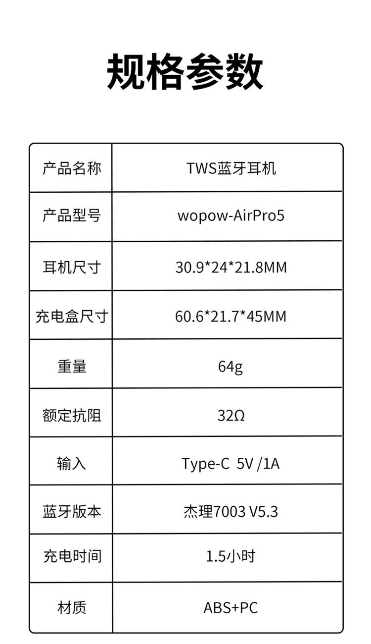 產(chǎn)品重量:單個(gè)耳機(jī)4.1g, 帶充電倉:64g
