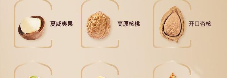 170g美國原色開心果*1 90g高原核桃*1 170g越南紫衣腰果*1 190g夏威夷果*1 200g新疆巴旦木*1 190g開口杏核*1