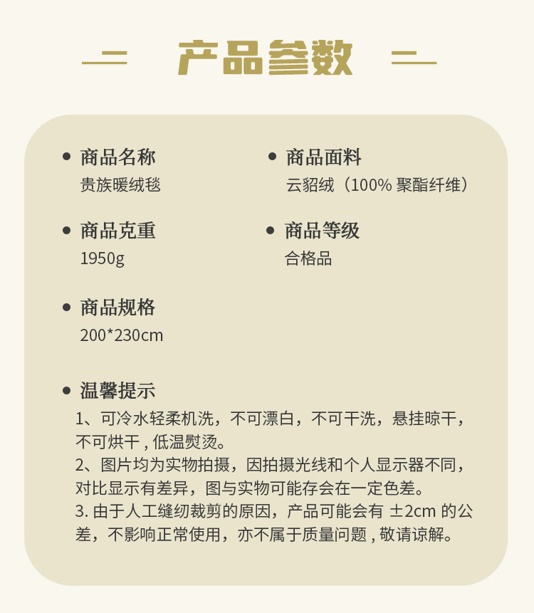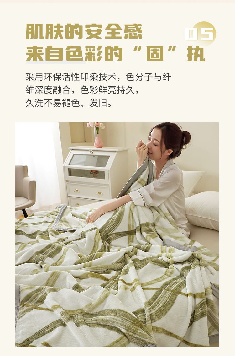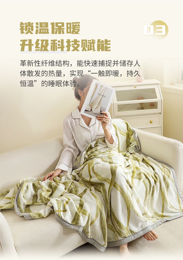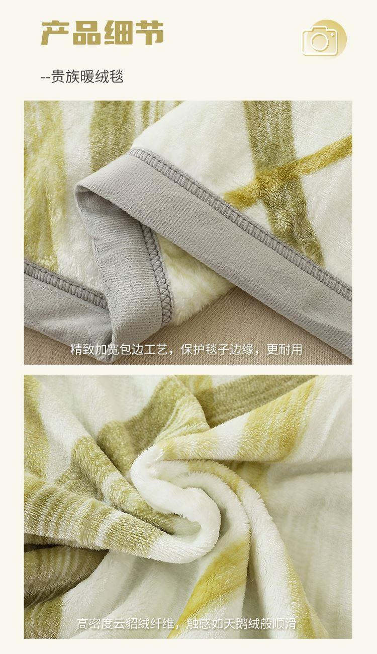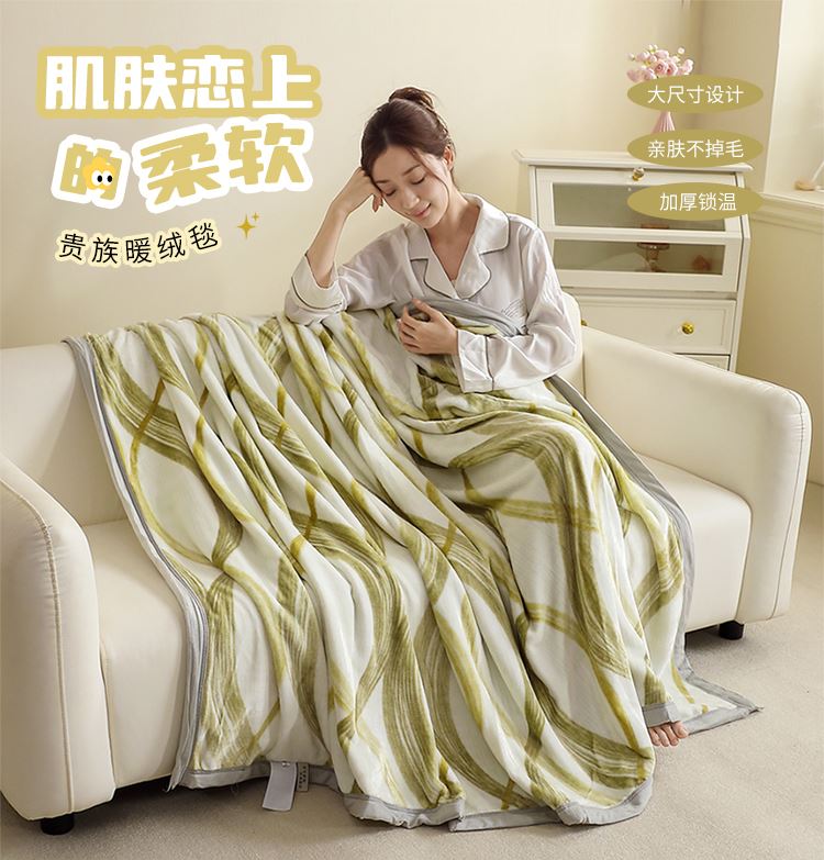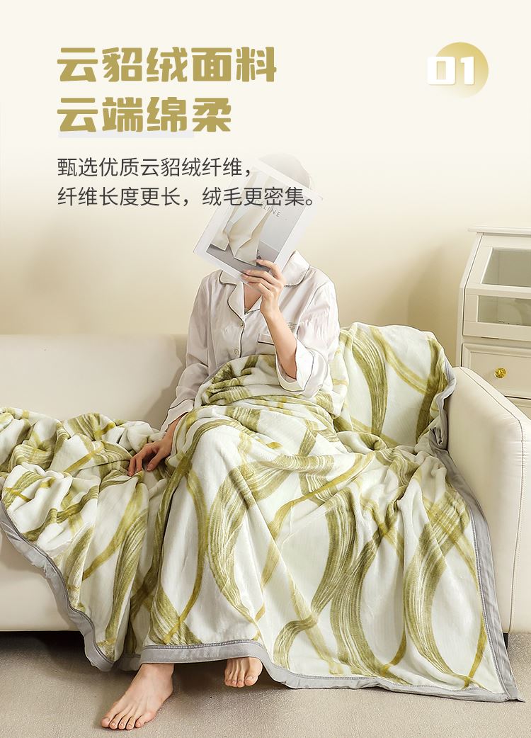 神秘、魅力的云貂絨、柔和溫暖的觸感,四季必備蓋毯。全活性印染工藝,垂懸性佳易打理,適用機(jī)洗不變形。雙面超柔面料經(jīng)縮絨、起毛等多道工序,豐滿(mǎn)細(xì)膩,寬邊色布包邊工藝時(shí)尚大方,400克平方克重,適用一年四季鋪、蓋,一毯多用,貼身親膚的特質(zhì)為您增添格外的溫暖與棉柔,是款適用于福利、商務(wù)及積分促銷(xiāo)的實(shí)用型贈(zèng)品。