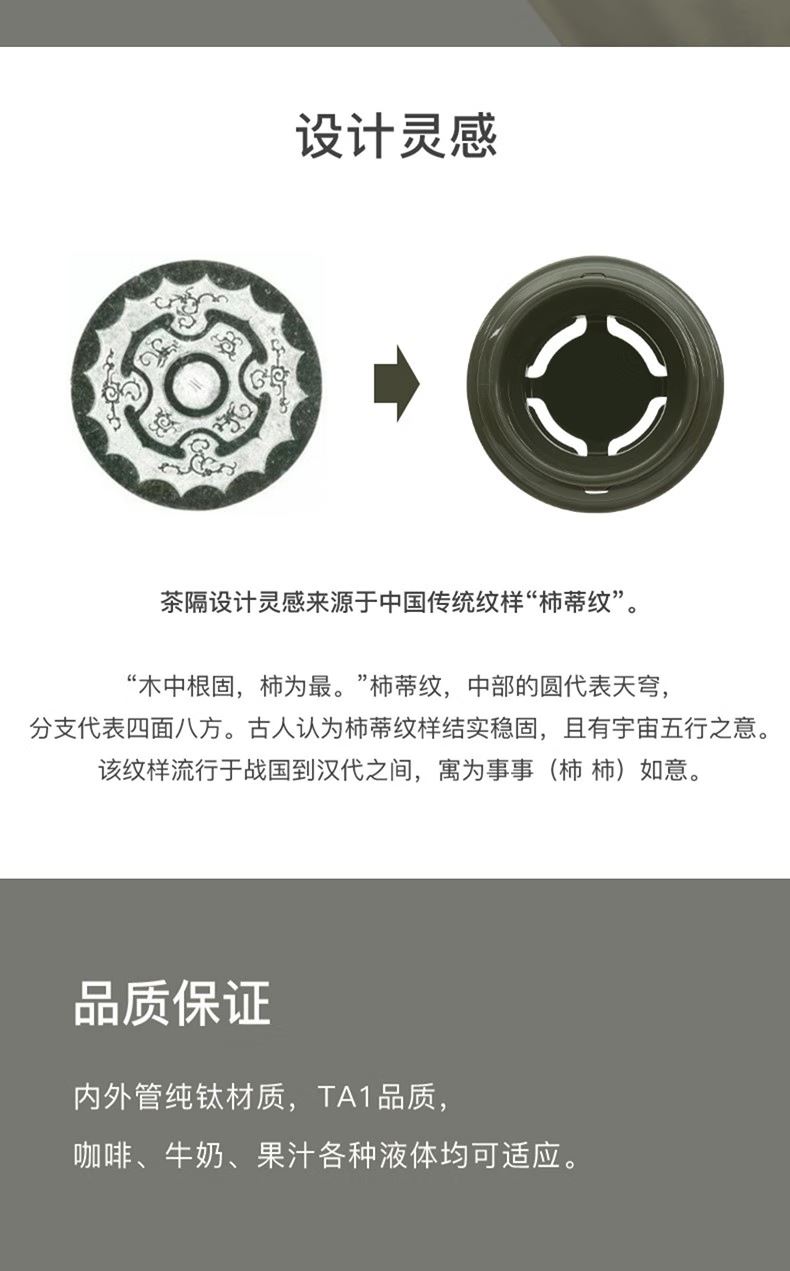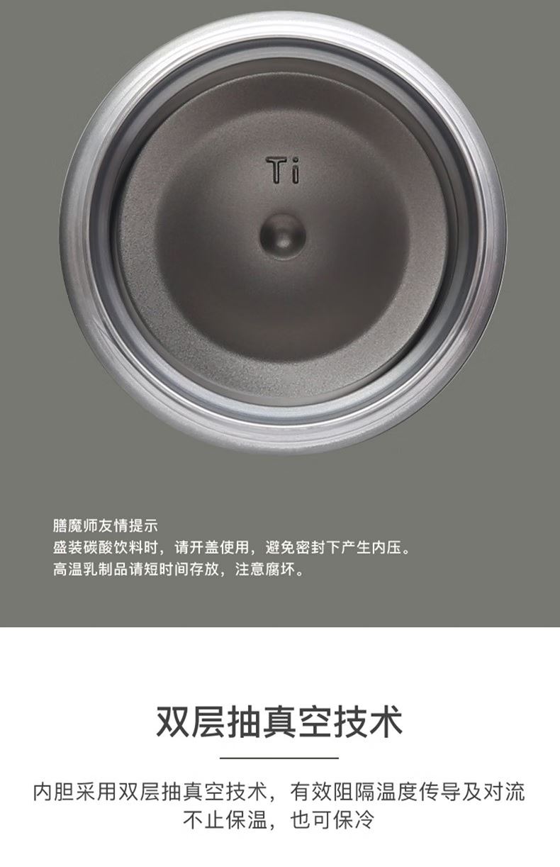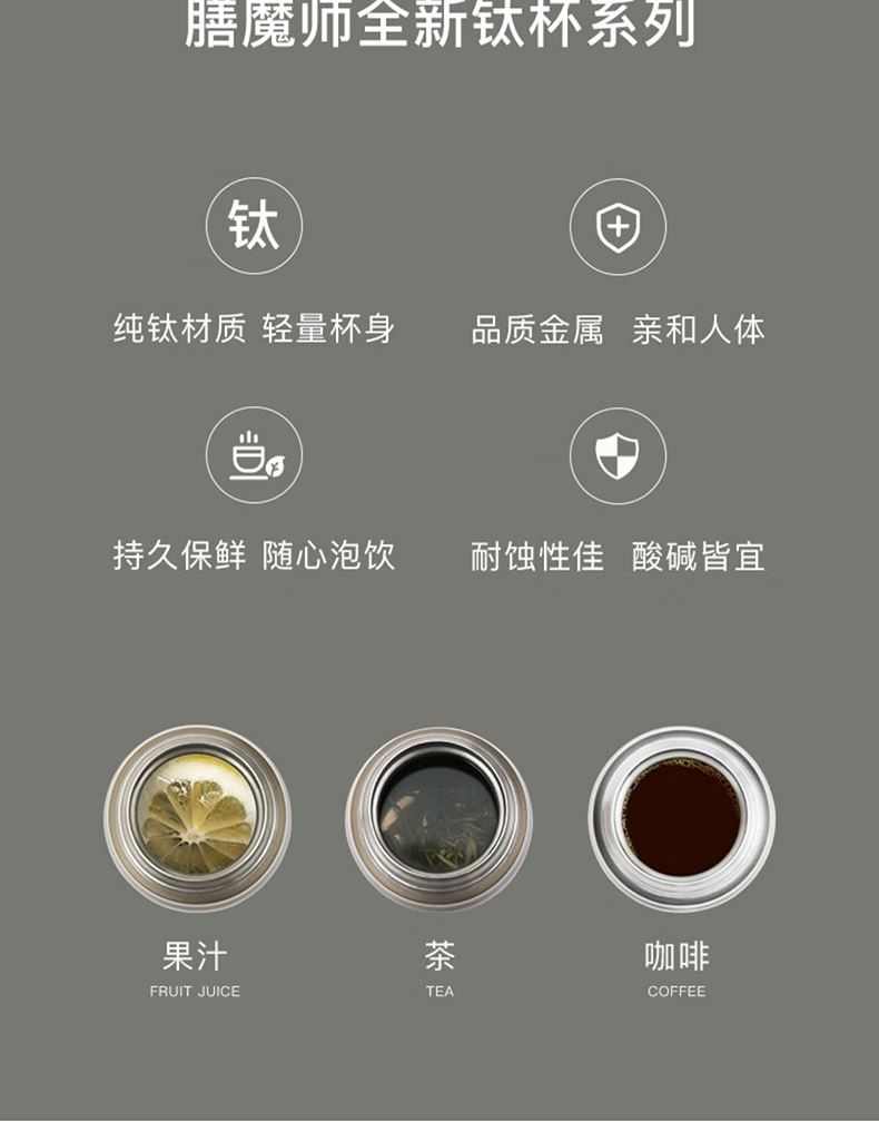 顏 色:GD礦石金 BL深海藍(lán) GY太空灰 容 量:550ml 類 型:旋蓋型帶茶漏 定 制:可以定制 材 質(zhì):純鈦 保 溫:6小時(shí)大約60°C 保 冷:6小時(shí)大約10°C