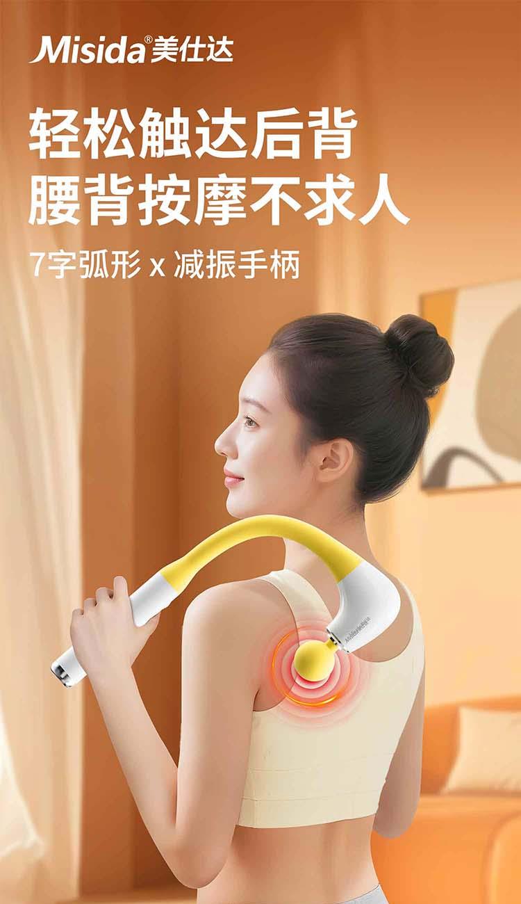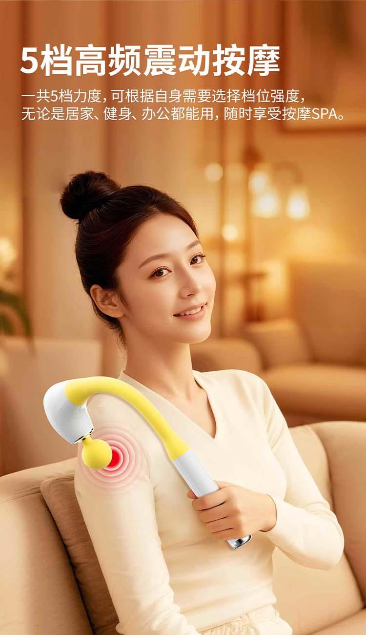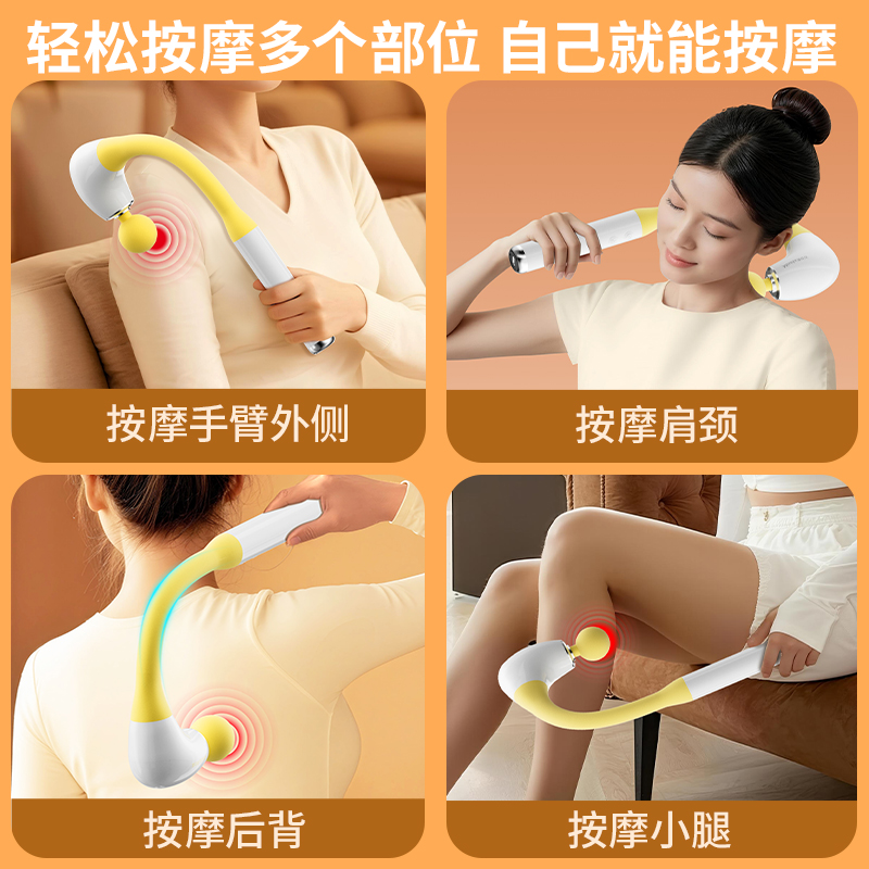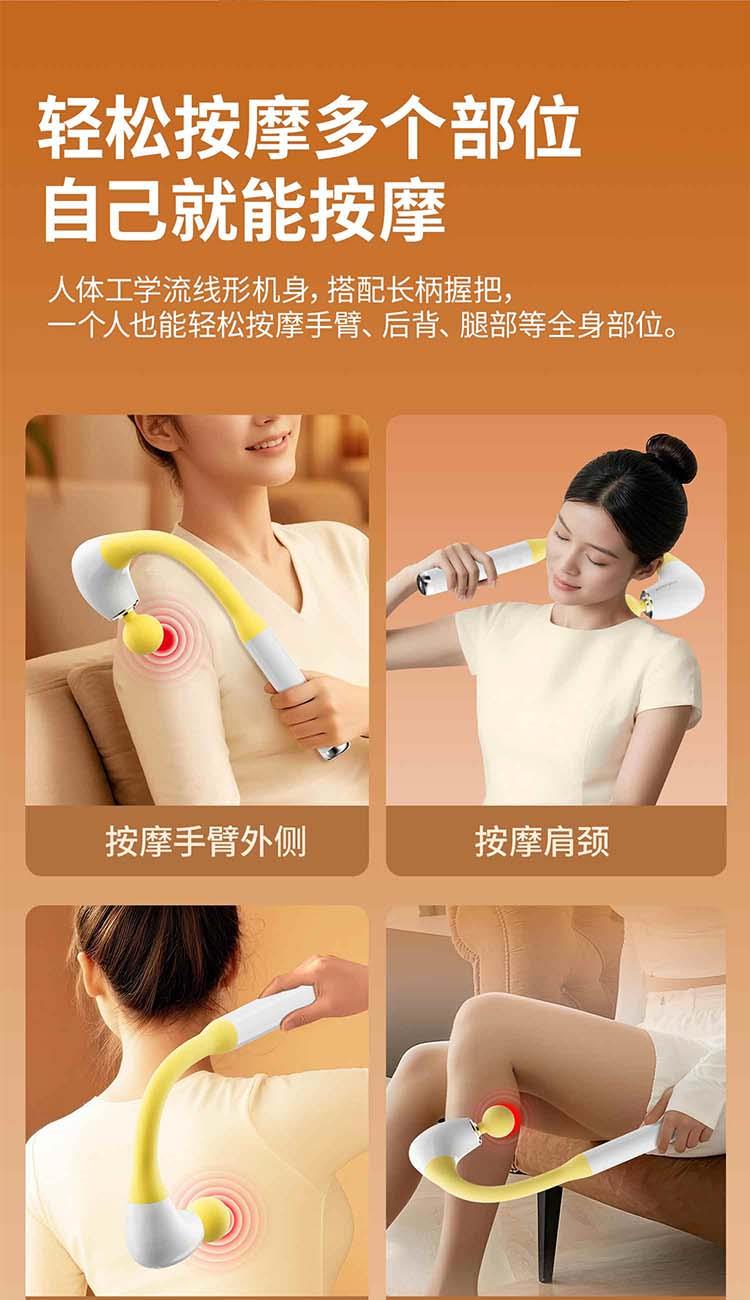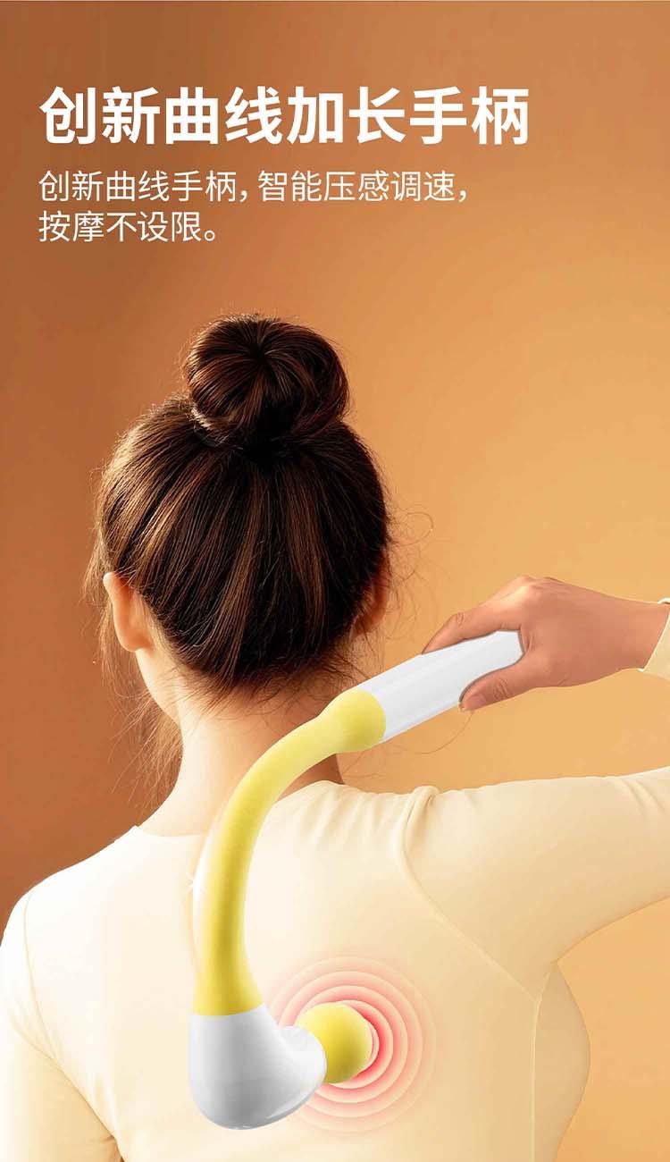 1. 創(chuàng)新加長(zhǎng)曲線手柄: 輕松觸達(dá)后背,腰背按摩不求人;